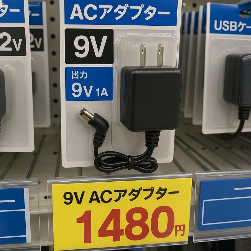 ドンキでは、スマホ・デジタル家電コーナーの一角や、PCアクセサリー・照明機器コーナーにACアダプターが並ぶことがあります。ただし、これらの多くは5V出力(USB規格準拠)であり、9V仕様のACアダプターが必要な機器(ギターエフェクター、小型音響機器、電子工作用デバイスなど)には使用できません。