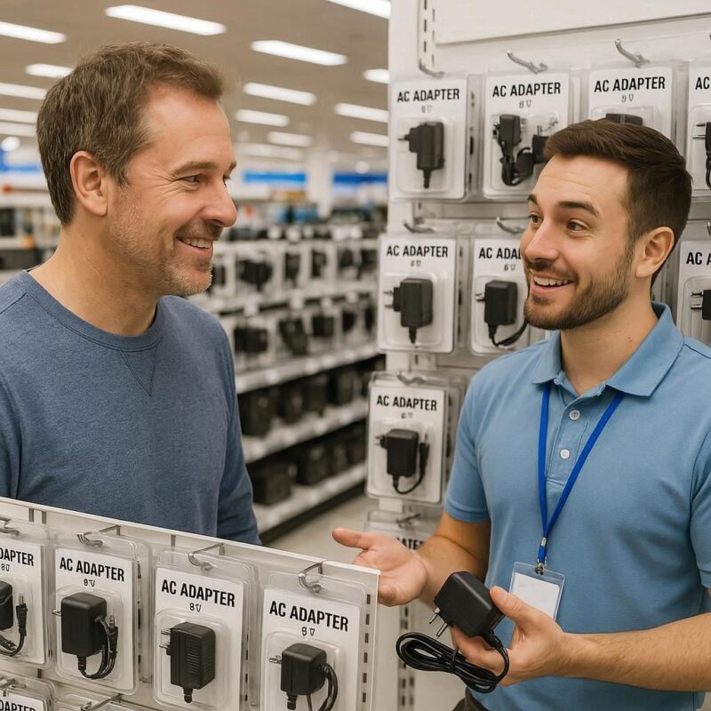 多くの店舗ではスマートフォンやタブレット向けのUSBアダプター、マルチポート充電器などが販売されていますが、9V仕様のACアダプターを常時取り扱っている店舗は限られています。