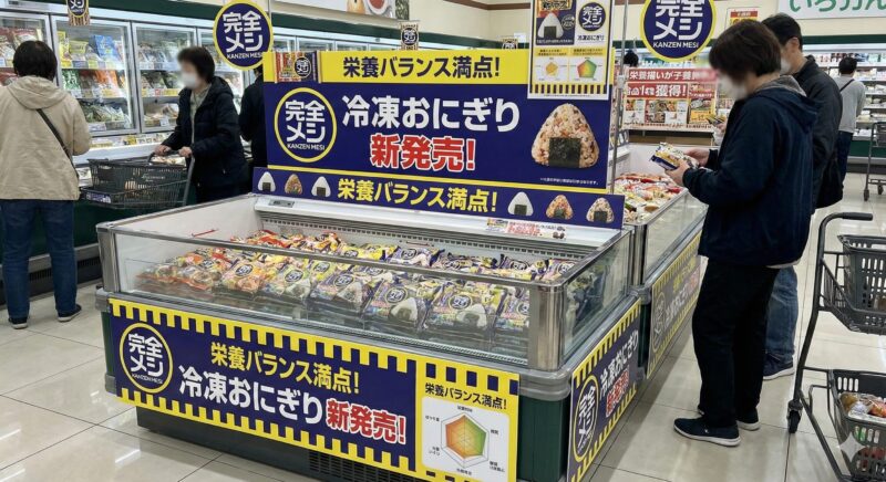 地域密着型のスーパーや全国チェーンの総合スーパーなどでは、冷凍食品コーナーに「冷凍ごはん」「冷凍おにぎり」「冷凍お弁当」といった区分があって、ここに「完全メシ」タイプのおにぎりが置かれていることがあるよ。